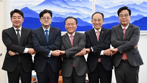 윤재옥 국민의힘 당대표 권한대행과 홍익표 더불어민주당 원내대표 등이 20일 오후 서울 여의도 국회 운영위원장실에서 회동을 갖고 2024년도 예산에 대해 최종 합의한 후 기념촬영을 하고 있다.