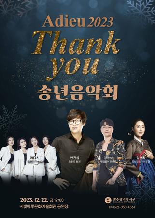 광주시 서구가 2023년을 마무리하며 구정 발전에 함께 한 주민들에게 특별한 무대를 선사한다. 서구는 오는 22일 오후 7시 서빛마루문예회관에서 ‘아듀 2023, 송년음악회 THANK YOU’를 개최한다.