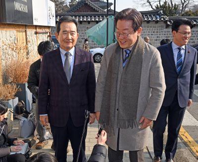 이재명(오른쪽) 더불어민주당 대표와 정세균 전 국무총리가 28일 서울 종로구의 한 음식점에서 오찬 회동을 위해 이동하고 있다. /뉴시스