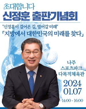 신정훈 의원은 오는 1월 7일 오후 2시 나주종합스포츠파크 다목적체육관에서 신정훈이 걸어온 길, 열어갈 미래를 담은 \'지방에서 대한민국의 미래를 찾다\' 출판기념회를 개최한다고 28일 밝혔다.