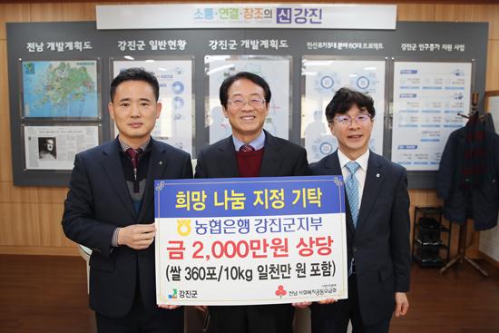 농협은행 강진군지부(지부장 김덕삼)는 지난 27일 희망나눔으로 현금 1000만원과 1000만원 상당의 쌀 360포를 기탁했다. 이에 앞서 군지부는 지난 8일 저소득 청소년을 위해 1200만원 상당의 백팩 70개를 기탁했다.