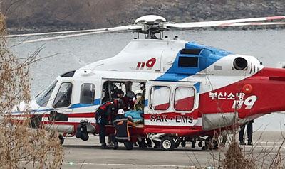 부산에서 흉기 피습을 당한 이재명 더불어민주당 대표가 2일 헬기를 통해 서울 동작구 노들섬에 도착, 서울대병원으로 이송되고 있다. 이 대표는 이날 오전 부산 가덕신공항 건설 예정지 현장방문 도중 흉기 피습 당했다.