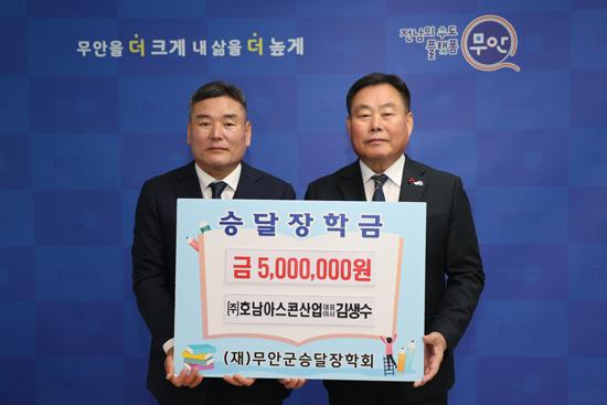 무안군은 지난 12월 27일 현경면에 소재한 ㈜호남아스콘 김생수 대표가 우수한 지역인재 양성을 위해 써달라며 (재)무안군승달장학회에 장학금 500만원을 기탁했다고 밝혔다.