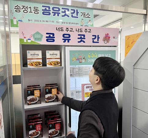 송정1동 행정복지센터 입구에 설치된 진열장, 냉장고를 둬 주민 누구나 쓰지 않는 물품, 먹지 않는 식품 등을 채우고, 필요한 사람은 자유롭게 가져갈 수 있도록 운영하고 있다.