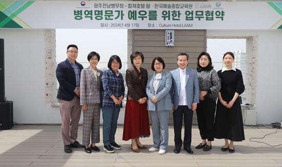 광주전남지방병무청은 17일 컬쳐호텔 람·한국예술종합학교교육원(주)와 병역명문가 예우를 위한 업무협약을 체결했다고 밝혔다.