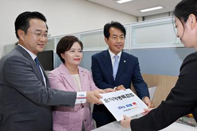 박성준(왼쪽부터) 더불어민주당, 정춘생 조국혁신당 윤종오 진보당 의원이 3일 오후 서울 여의도 국회 의안과에 야 5당이 공동발의한 순직해병특검법안을 제출하고 있다.