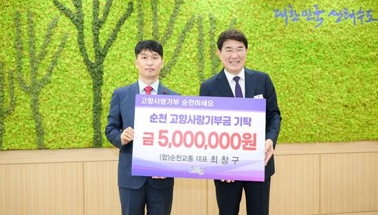 (합)순천교통 최창구 대표가 7일 순천시청을 방문해 고향사랑기부금 1인 연간 최대 한도액인 500만원을 기탁했다. 이는 올해 고향사랑기부제 순천시의 첫 최고액 기부자에 해당된다.