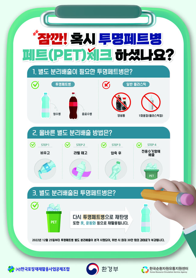 정미경 자원순환과장은 “제도 정착을 위해서는 무엇보다 시민 참여가 중요하다”며 “쓰레기를 버리는게 아닌 자원을 배출한다는 생각으로 투명페트병을 올바르게 분리배출해 주길 당부드린다”고 말했다.