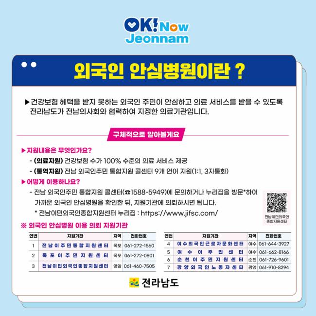 외국인 안심병원은 외국인 주민의 의료 접근성을 높이고 안정적인 의료서비스를 제공하기 위해 전라남도가 전남의사회와 협력해 지정하는 의료기관이다.