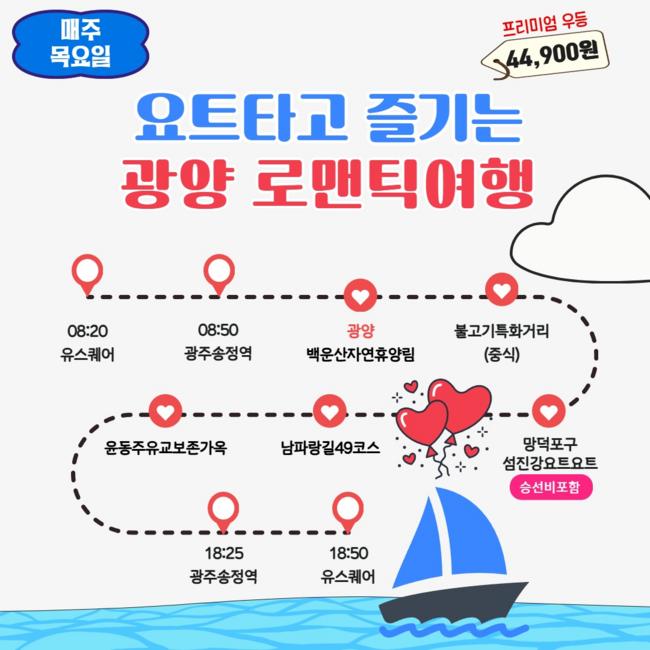 이번 코스는 광양의 천년 숲과 섬진강, 망덕포구에 요트의 낭만을 더한 일정으로, 현재 사전 예약이 활발히 진행되고 있다.