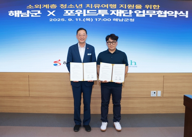 해남군과 포위드투 재단(ForWithTo Foundation)은 지난 11일 소외계층 청소년들의 문화향유권 증진을 위한‘포위드투 여행 프로젝트 업무협약’을 체결했다고 밝혔다.