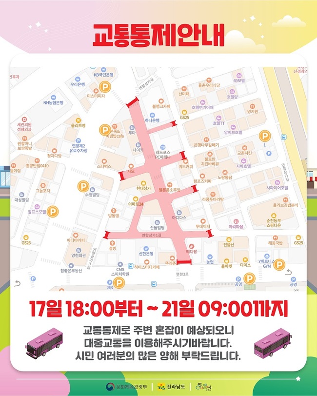 주말의 광장 트레이드마크는 단연 ‘잔디로드’로, 평범한 연향동 거리를 싱그러운 초록빛 휴식 공간으로 탈바꿈한다. 여기에 순천시 대표 캐릭터 루미의 10M 대형 조형물과 포토존이 더해져, SNS 핫플레이스가 탄생할 것으로 기대된다.