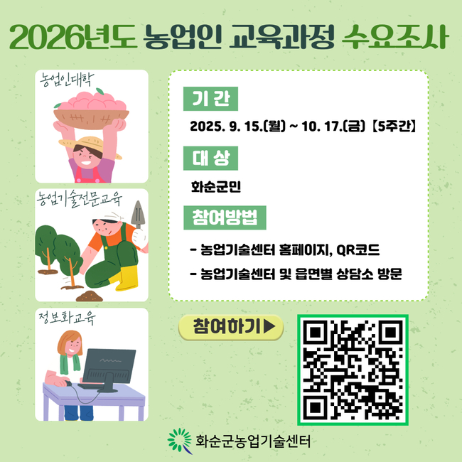화순군은 2026년도 농업인 교육과정 운영에 앞서 실효성 높은 맞춤형 교육과정 편성을 위해 오는 15일부터 다음달 17일까지 5주간 농업인을 대상으로 수요 조사를 진행한다고 밝혔다.