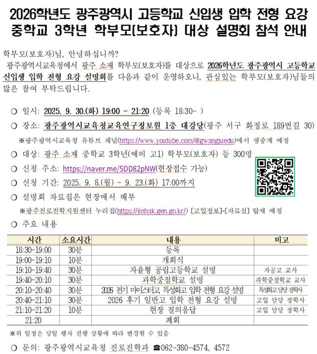 광주시교육청은 오는 30일 오후 7시 광주시교육청교육연구정보원 대강당에서 중학교 3학년 학생과 학부모를 대상으로 ‘고입 전형요강 설명회’를 개최한다고 밝혔다.