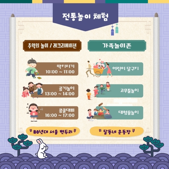어린이 달구지, 고무줄놀이 등 가족놀이존과 소원지 쓰기 이벤트, 달고나·뻥튀기 같은 추억의 먹거리 판매도 현장 분위기를 더한다.