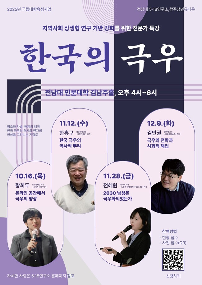 2025년 국립대학 육성사업의 일환으로 전남대학교 5·18연구소와 광주청년유니온이 공동 주최하는 이번 강연 시리즈는 12·3 계엄 이후 사회적 문제로 부상한 한국 극우의 양상과 역사, 현재의 흐름, 그리고 대응 방안을 심도 있게 탐구할 예정이다.