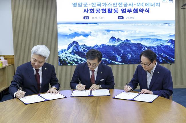 영암군이 지난 15일 군청에서 한국가스안전공사 전남서부지사, MC에너지(주)와 ‘사회공헌활동 업무협약’을 맺었다고 밝혔다.