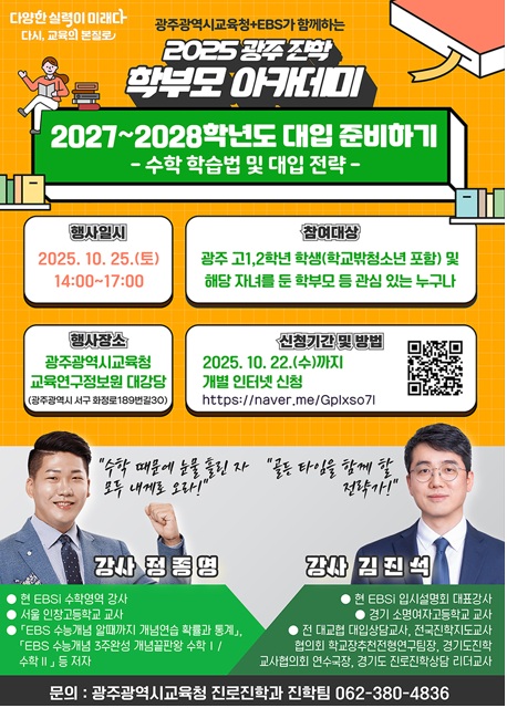 아카데미 참여를 희망하는 학생, 학부모는 오는 22일까지 광주진로진학지원센터 누리집을 통해 신청하거나, 당일 현장 접수도 가능하다. 특강은 행사가 끝난 후 EBSi 홈페이지에 탑재될 예정이다.