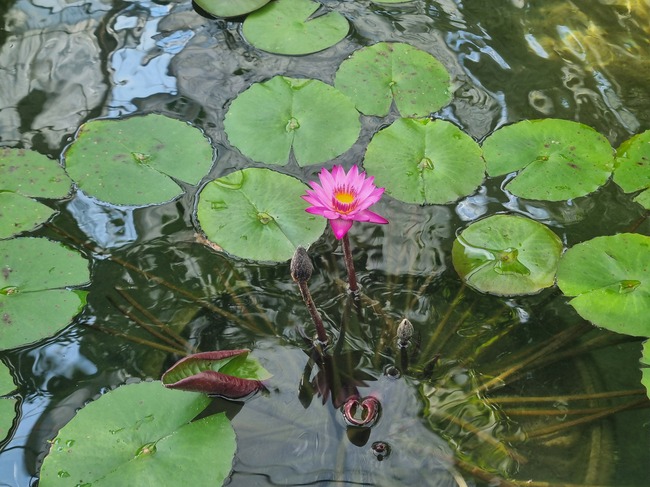 연못 위에는 수련이 곱게 피어 아름다움을 더하고, 주변에는 물칸나, 코브라아비스 등 다양한 수생식물이 조화를 이루며 다채로운 자연미를 선사한다.