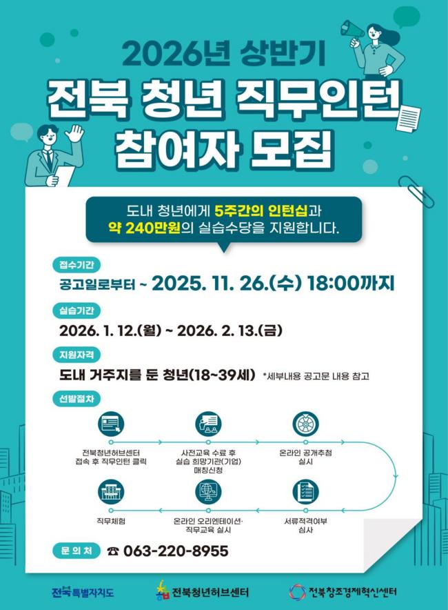 전북특별자치도와 전북창조경제혁신센터가 ‘2026년 상반기 전북 청년 직무인턴’ 참여자를 이번 달 26일까지 모집한다.