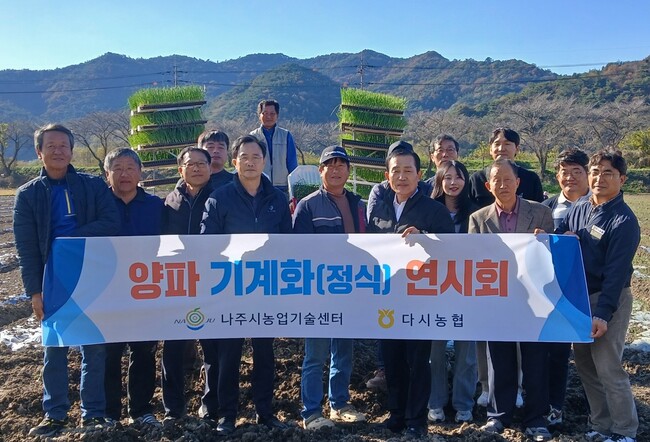 나주시가 다시농협과 협력해 ‘양파 기계화 정식 연시회’를 개최하고 고령화와 인건비 상승 등으로 어려움을 겪는 양파 재배 농가의 작업 부담을 줄이고 재배 효율을 높이기 위한 기계화 기술 보급에 본격적으로 나섰다.
