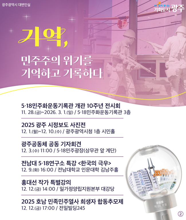 광주광역시는 ‘빛의 혁명, 기억과 연대’를 주제로, 광주가 지켜온 민주·인권·평화의 가치를 시민들과 함께 나누고 체험하는 장을 12월 1일부터 12일까지 운영한다.