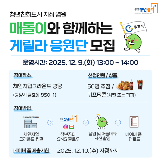 참여를 희망하는 시민은 행사 당일 체인지업그라운드 광양에서 게릴라 응원에 참여한 후 매돌이와 인증사진을 촬영하면 된다.