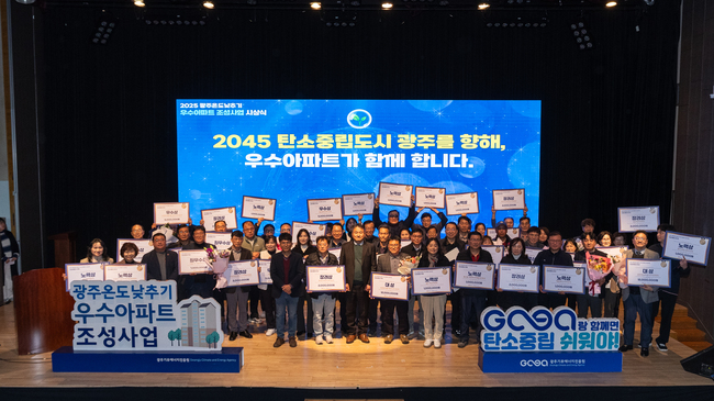 광주광역시는 지난 11일 광주디자인진흥원 이벤트홀에서 ‘2025 광주온도낮추기 우수아파트 시상식’을 열고, 탄소중립 생활 실천 활동에 참여한 우수아파트 54곳을 시상했다고 밝혔다.
