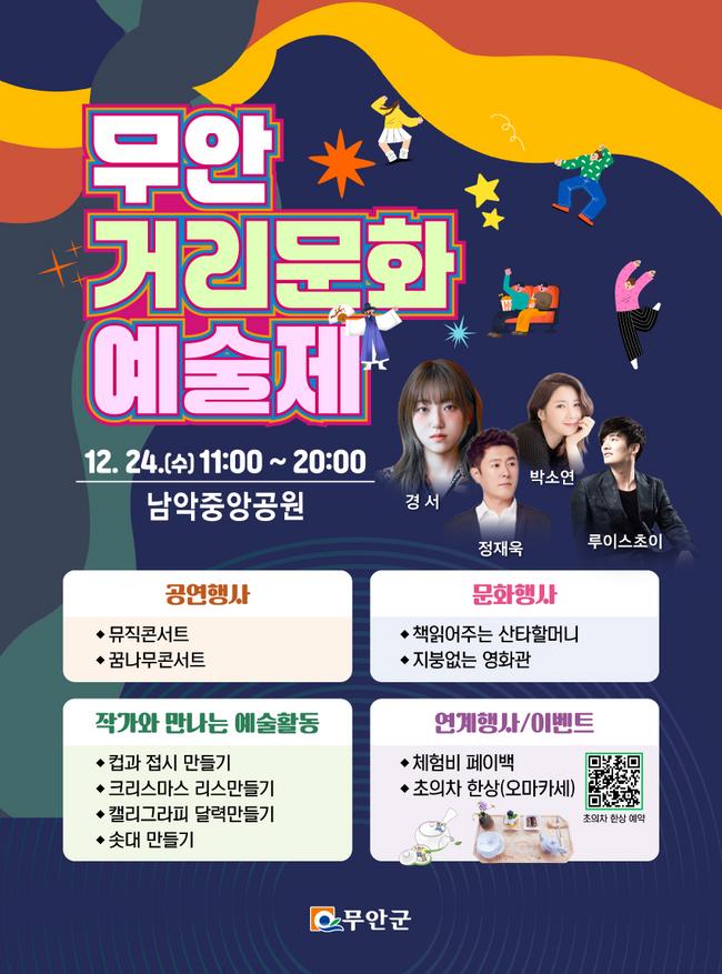 무안군은 오는 24일 남악 중앙공원 일원에서 ‘문화 캔버스 도시, 예술로 물들다’ 라는 주제로 무안거리문화예술제를 개최한다고 밝혔다.