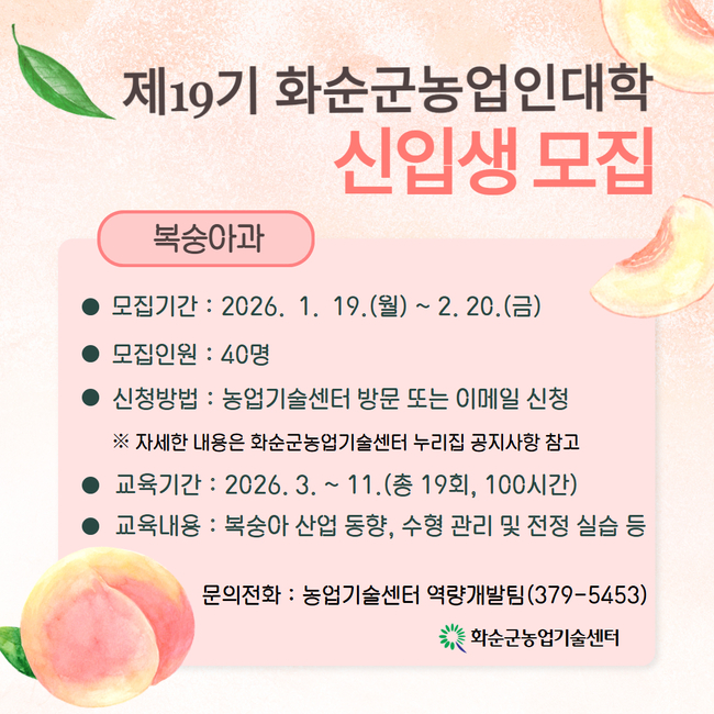 군에 따르면 모집 기간은 오는 1월 19일부터 2월 20일까지로, 올해 화순군농업인대학은 지역 특화 작목인 복숭아 산업의 경쟁력 강화를 목표로 복숭아 단일 학과를 개설해 총 40명의 교육생을 선발할 예정이다.