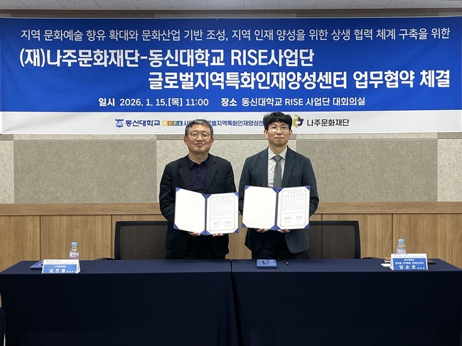 나주문화재단은 동신대학교 RISE사업단 글로벌지역특화인재양성센터와 지난 15일 지역 문화예술 향유 확대와 문화산업 기반 조성, 청년 인재 양성을 위한 업무협약을 체결했다고 밝혔다.