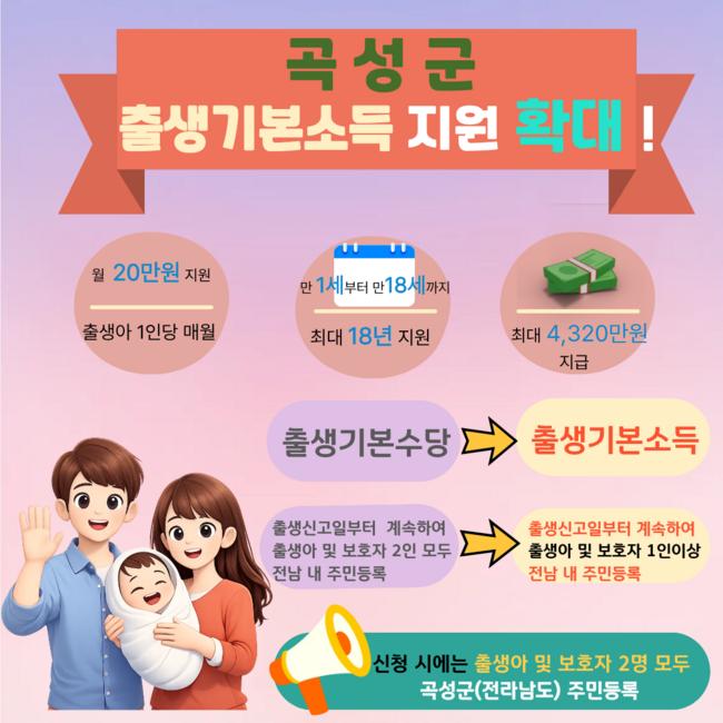 곡성군은 저출산 대응과 안정적인 양육 환경 조성을 위해 출생기본소득 지원사업의 자격 기준을 확대 운영한다.