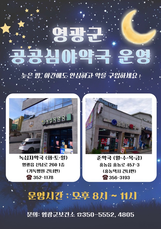 이번에 지정된 공공심야약국은 요일별로 운영되며, ▲녹십자약국은 화·토·일요일(영광읍 신남로 260 1층, ☎352-1178), ▲준약국은 월·수·목·금요일(홍농읍 홍농로 457-3, ☎356-3193)에 운영된다.