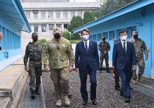 판문점을 방문한 이인영 통일부장관이 16일 오전 경기 파주시 판문점 군사분계선을 둘러보고 있다.