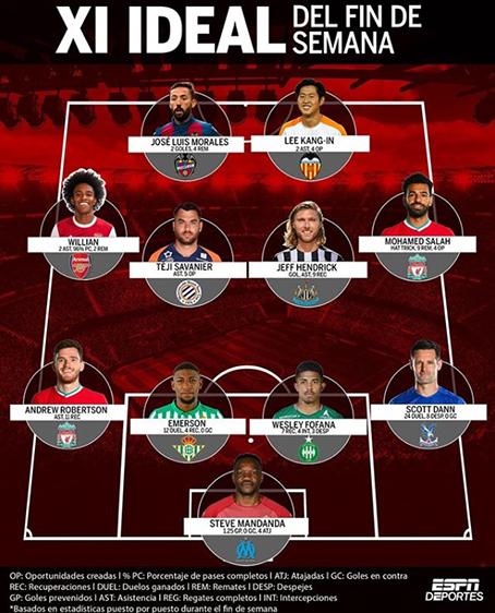 미국 스포츠전문매체 ESPN의 스페인어권 채널 'ESPN 데포르테'는 16일(한국시간) 소셜네트워크서비스(SNS)를 통해 지난 주말 벌어진 잉글랜드 프리미어리그(EPL), 스페인 라리가, 프랑스 리그앙 경기를 대상으로 베스트11을 선정했다.