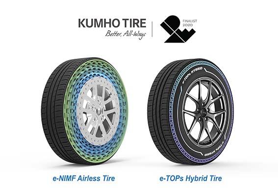 금호타이어가 수상한 제품은 미래 지향적 기술력을 담은 컨셉트 타이어인 에어리스 타이어 e-NIMF와 하이브리드 타이어 e-TOPs 등 2종이다.
