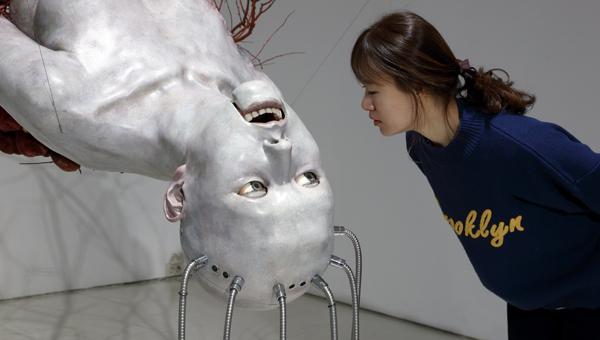 대화형 인간 로봇의 귀에 질문을 하면 눈동자와 입술을 움직이며 대답을 하는 특별한 작품이다.