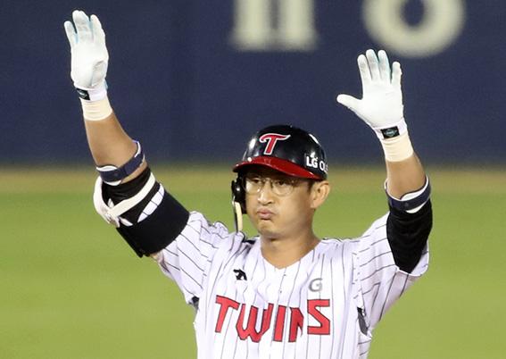 6일 오후 서울 송파구 잠실야구장에서 열린 2020 신한은행 SOL KBO리그 삼성라이온즈와 LG 트윈스 경기, LG 박용택이 9회말 KBO 역대 최초 2500 안타를 달성, 2루에 진루한 뒤 세리머니 하고 있다.