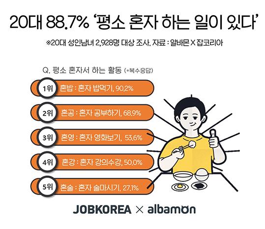 11일 아르바이트 대표 포털 알바몬이 잡코리아와 함께 20대 남녀 2928명을 대상으로 ‘나홀로족 트렌드’에 대해 조사한 결과에 따르면 설문에 참여한 20대 응답자 중 88.7%가 ‘평소 혼밥, 혼영 등 혼자서 해결하는 것들이 있다’고 답했다.