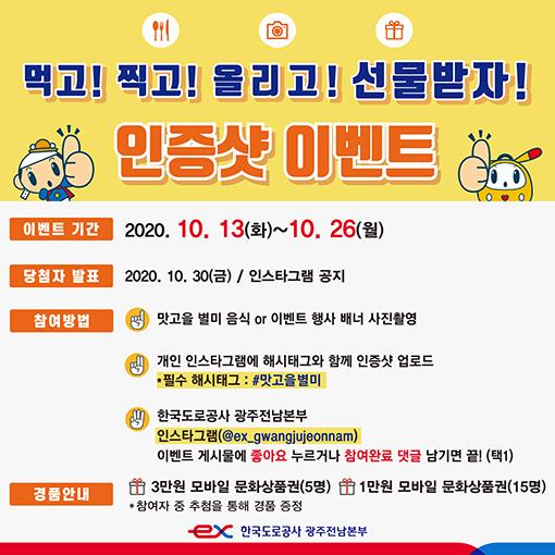 이 기간 동안 ‘맛고을 별미’ 음식 사진이나 휴게소에 설치된 이벤트 행사 배너 사진을 찍은 인증샷을 개인 인스타그램에 등록하고 ‘한국도로공사 광주전남본부’ 인스타그램의 이벤트 행사 게시물을 검색한 후에 이벤트에 참여하면 된다.