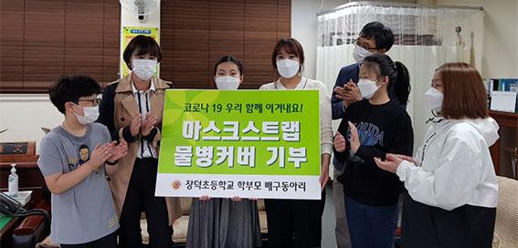 장덕초 학부모 배구동아리가 14일 1학년 학생들에게 ‘물병 커버’를, 6학년 학생들에게 ‘마스크 스트랩’을 전달했다.