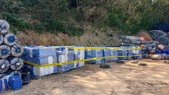 해경에 따르면 형사기동정 P-115정은 14일 오후 1시 50분께 고흥군 도화면 산속 빈터에서 검은색 차양막으로 덮어 보관중인 무기산 1540통을 발견하고 소유자 A씨를 검거했다.