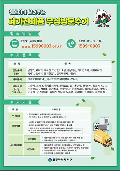 서구 관계자는 “이번 서비스는 주민이 직접 대형 폐가전을 수거장소로 옮겨야 하는 어려움과 배출 수수료 부담을 해소하기 측면이다”며 많은 주민분들께서 이를 적극 활용해 주시길 바란다“고 말했다.