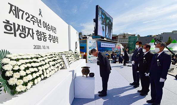 여수시와 여순사건 시민추진위원회는 이날 오전 10시 중앙동 이순신광장에서 희생자 유족과 정치권, 공직자가 참석한 가운데 억울하게 죽임을 당한 희생자를 추모하고, 지역민의 화합과 상생을 기원하는 '제72주년 여순사건 희생자 합동 추념식'을 열어 그날의 아픔을 되새겼다.