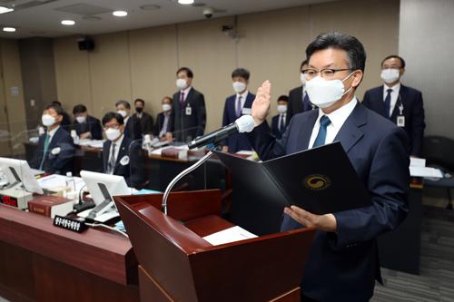 20일 오전 광주 북구 오룡동 정부광주합동청사에서 열린 국회 기획재정위원회의 광주지방국세청, 한국은행 광주전남본부·목포본부에 대한 국정감사에서 송기봉 광주지방국세청장 등 피감기관 관계자가 증인선서를 하고 있다.