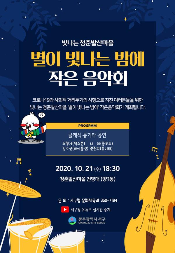 서구는 21일 오후 6시 30분 양3동 소재의 청춘발산마을 전망대에서 ‘빛나는 청춘발산마을, 별이 빛나는 밤에 작은 음악회’를 개최한다고 밝혔다.