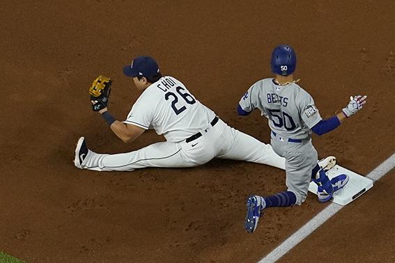 탬파베이 레이스 1루수 최지만이 23일(현지시간) 미 텍사스주 알링턴의 글로브 라이프 필드에서 열린 LA 다저스와의 2020 MLB 월드시리즈 3차전 1회 다리 찢기 수비를 펼치며 무키 베츠를 아웃시키고 있다.