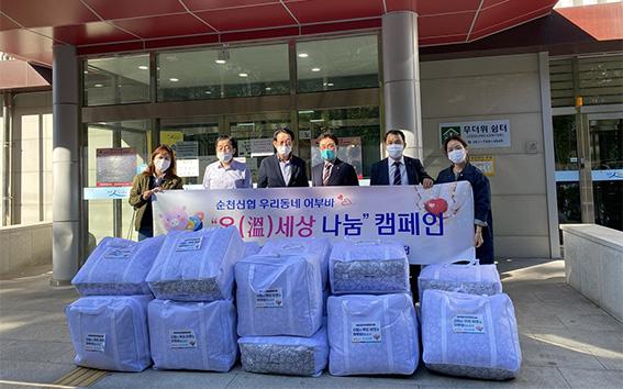 순천신협은 매년 ‘온(溫)세상 나눔 캠페인’을 실시하고 있으며, 2018년도에는 전기온열기 10대와 이불 11채, 2019년에는 이불 21채를 기부했고 지난 9월에는 장애아동 가구에 벽지·장판 교체 봉사활동에 직접 참여하는 등 꾸준한 나눔 활동을 펼치고 있다.