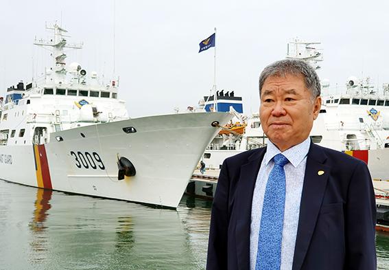 목포해경 소속 3009함 앞에선 명기환 시인. (사진=목포해경 제공)