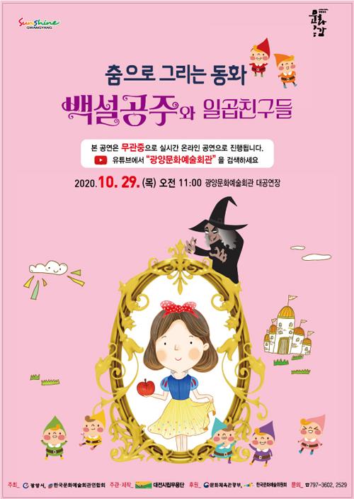 광양시는 코로나19 확산 방지를 위해 29일 춤으로 그리는 동화 ‘백설공주와 일곱친구들’ 공연을 무관중 온라인으로 선보인다고 밝혔다.